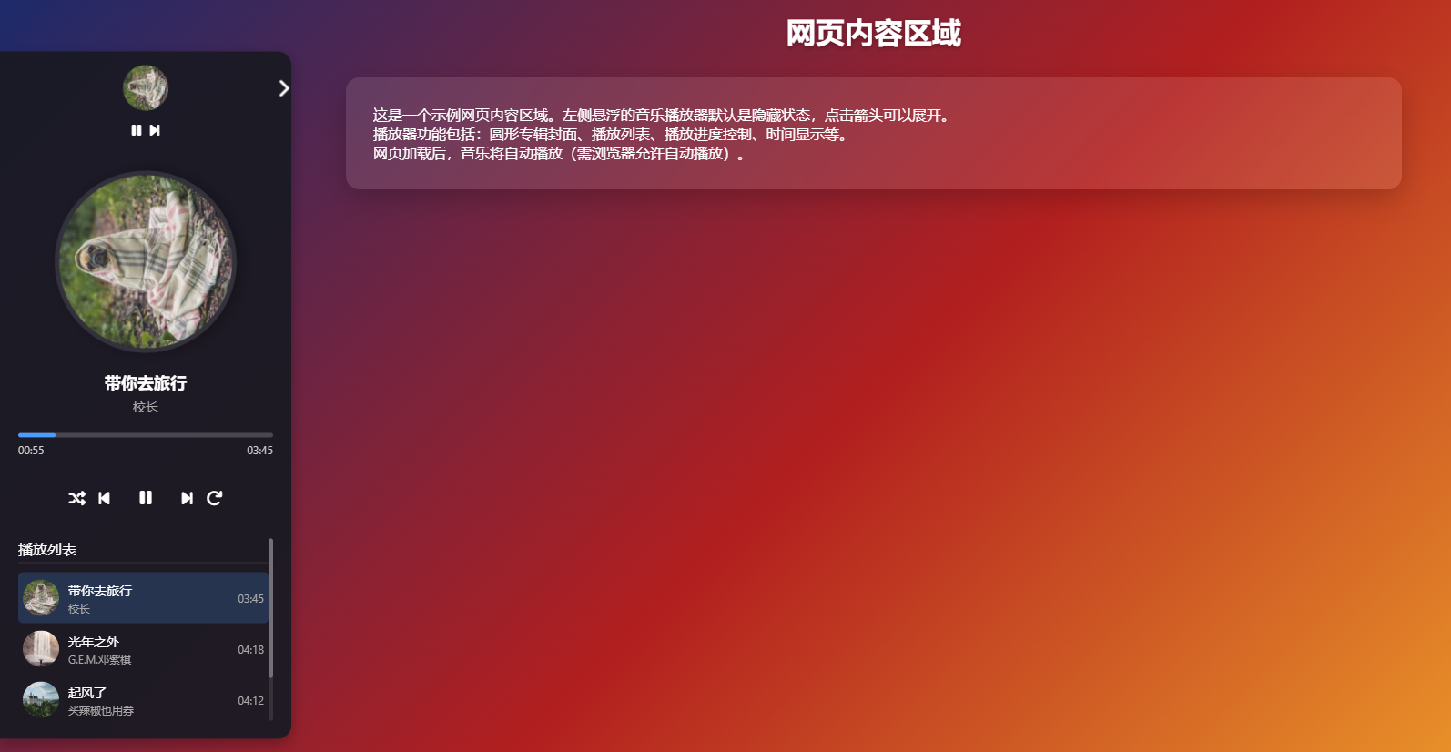 这是一个示例网页内容区域。左侧悬浮的音乐播放器默认是隐藏状态,点击箭头可以展开。播放器功能包括:圆形专辑封面、播放列表、播放进度控制、时间显示等。
